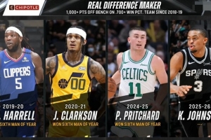 轉播方曬出一組數據圖片:自2018-19賽季以來,替補球員單賽季砍下至少1000分且球隊勝率70%以上的球員有: