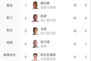 本賽季歐冠射手榜+助攻榜,皇馬和拜仁球員占據(jù)前二
