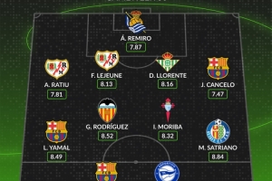 中場(chǎng):亞馬爾(巴薩)、圭多·羅德里格斯(瓦倫西亞)、莫里巴(塞爾塔)、薩特里亞諾(赫塔費(fèi))