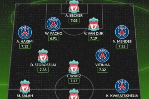 體育資訊4月8日訊 歐冠淘汰賽巴黎對陣利物浦的比賽即將打響,數據網站Whoscored也盤點了兩隊球員在本賽季歐冠場均評分最高陣容(至少出場500分鐘),具體如下: