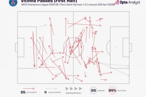 數(shù)據(jù)統(tǒng)計顯示,維蒂尼亞半場便完成了65次傳球,而利物浦全隊共計僅82次。
