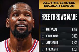 截至發(fā)稿時,火箭球星杜蘭特罰球4中4,生涯常規(guī)賽罰球命中數(shù)來到7695個,超越“大O”奧斯卡·羅伯特森(7694個)升至歷史第六,前面一位是科比(8378個)。