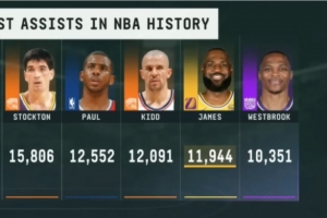 據(jù)統(tǒng)計(jì),詹姆斯生涯至今共送出11944次助攻,排名歷史第4,距離第三的基德僅差不到150次(147次)。