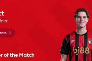 本場比賽伯恩茅斯中場斯科特表現(xiàn)活躍,打進球隊第二粒進球,賽后他也當選英超官方評選出的本場比賽最佳球員。