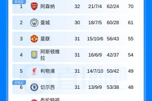 還有懸念!英超積分榜:阿森納多賽2場領先9分,曼城將客戰切爾西