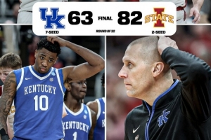 體育資訊3月23日訊 今日瘋?cè)?2強(qiáng)賽,愛荷華州立大學(xué)以82比63大勝肯塔基大學(xué),再次將這支傳統(tǒng)勁旅擋在甜蜜16強(qiáng)門外。