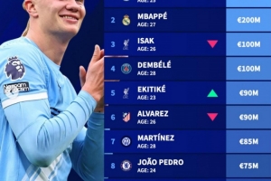 體育資訊4月13日訊 德轉更新了足壇中鋒身價情況,哈蘭德和姆巴佩均兩億歐,伊薩克、登貝萊均1億歐緊隨其后。