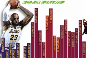 詹姆斯生涯各季扣籃數:本賽季97扣湖人生涯新高 生涯最高為145扣