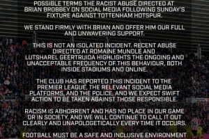 我們堅(jiān)定地與布羅比站在一起,并向他提供我們?nèi)媲覉?jiān)定不移的支持。這不是一起孤立事件。近期針對(duì)羅曼·蒙德?tīng)柡秃L乩找吝_(dá)的辱罵行為,突顯了這種無(wú)論在球場(chǎng)內(nèi)還是網(wǎng)絡(luò)上仍在發(fā)生且頻率令人無(wú)法接受的行徑。