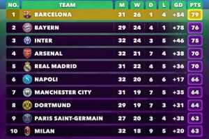 體育資訊04月13日訊 歐洲五大聯(lián)賽已經(jīng)進(jìn)入最后沖刺階段,Score90統(tǒng)計(jì)了五大聯(lián)賽合并的積分榜,表格從左至右分別為比賽場(chǎng)數(shù)、勝、平、負(fù)、凈勝球以及積分。巴薩以79分位居第一,拜仁第二,國(guó)米第三,阿森納第四。