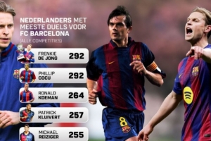 德容為巴薩292次出場,追平科庫并列隊史荷蘭球員紀錄