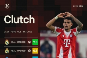 據Sofascore統計,迪亞斯近5場歐冠比賽皆參與進球,5場比賽總計打進3球,助攻3次。