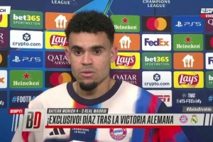 體育資訊4月16日訊 歐冠1/4決賽次回合比賽,路易斯·迪亞斯破門,拜仁主場4-3擊敗皇馬,總比分6-4晉級四強,賽后迪亞斯接受了媒體的采訪。