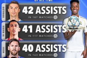 維尼修斯升第5!歐冠歷史助攻榜:C羅、天使、梅西前三 內馬爾第4