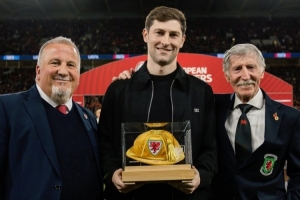體育資訊3月28日訊 威爾士隊(duì)向本·戴維斯頒發(fā)“金色帽子”,表彰他達(dá)成威爾士隊(duì)出戰(zhàn)100場(chǎng)里程碑。