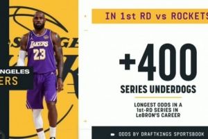 據ESPN統計,湖人首輪戰勝火箭晉級的賠率為+400(投注100,若押中連本帶利得500),這是詹姆斯生涯其所在球隊在季后賽首輪的最差賠率。