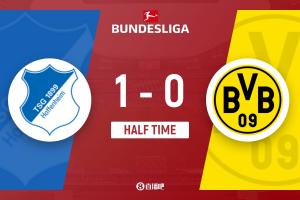第38分鐘,霍村獲得點球!克拉馬里奇右路弧頂內切打門打在滑到的聚勒手上,裁判經過VAR回放判罰點球,克拉馬里奇主罰點球破門,隨后聚勒拉傷被換下,霍芬海姆1-0多特。↓