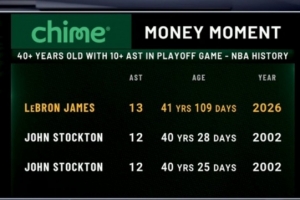 轉播方曬出統計,詹姆斯今日13次助攻刷新了歷史上40歲球員季后賽單場助攻紀錄,此前是斯托克頓的12次。