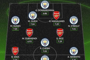 體育資訊4月19日訊 本輪英超焦點戰曼城對陣阿森納即將打響,數據網站Whoscored也列出本賽季兩隊球員在英超場均評分最高陣,其中曼城7人在列,具體如下: