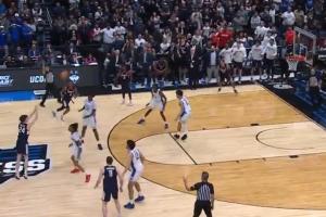 末節(jié)最后10秒(杜克72-70康大),杜克后場(chǎng)發(fā)球。球隊(duì)后衛(wèi)凱登·布澤爾接球轉(zhuǎn)身后面對(duì)康大雙人包夾,躍起欲傳球被攔下,發(fā)生致命失誤。
