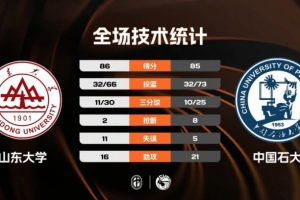 末節(jié)比賽,雙方依舊是打得難解難分,中國石大半節(jié)時間僅拿到4分被山東大學(xué)追上并反超,比賽懸念打到了最后,關(guān)鍵時刻廉舒予命中準(zhǔn)絕殺三分球反超,中國石大最后一球直接失誤錯失機(jī)會,最終山東大學(xué)86-85險勝中國石大。