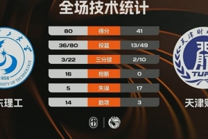 第四節,王虹延續火力,天津財大不斷沖擊內線苦苦支撐,王虹和邢欣相繼三分穿針,馬芮瑩反擊將分差拉開到40分以上,朱明慧內線得手,最終,山東理工80-41大勝天津財大。