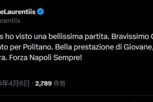 體育資訊4月7日訊 在那不勒斯1-0擊敗米蘭奪回意甲第二名后,那不勒斯主席德勞倫蒂斯更新社交媒體。